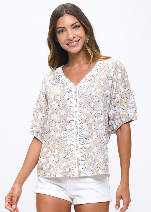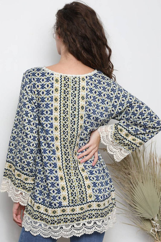 Nostalgia Printed Long Bell Sleeve Top With Lace Trim. 50% Off Clearance sale!