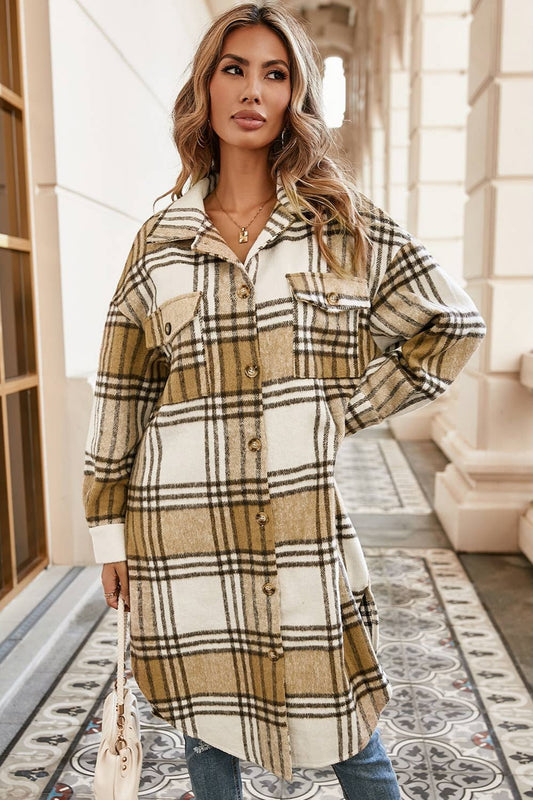 Little Daisy Closet Khaki Colorblock Plaid Print Button Up Midi Shacket