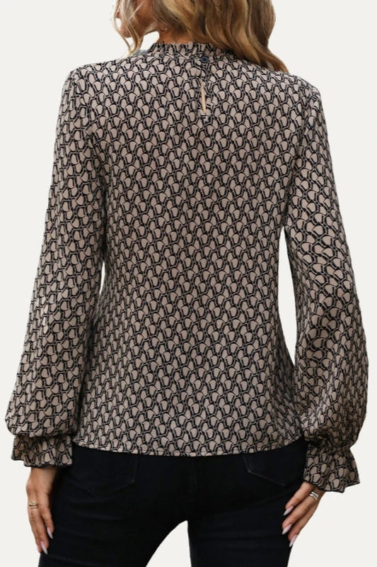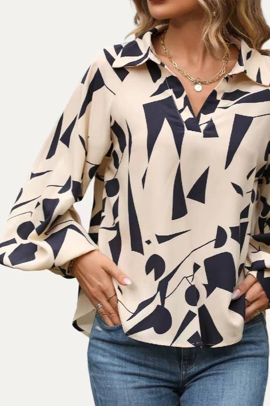The Moment Collection Chic Pattern Print Collared Neck Long Sleeve Top