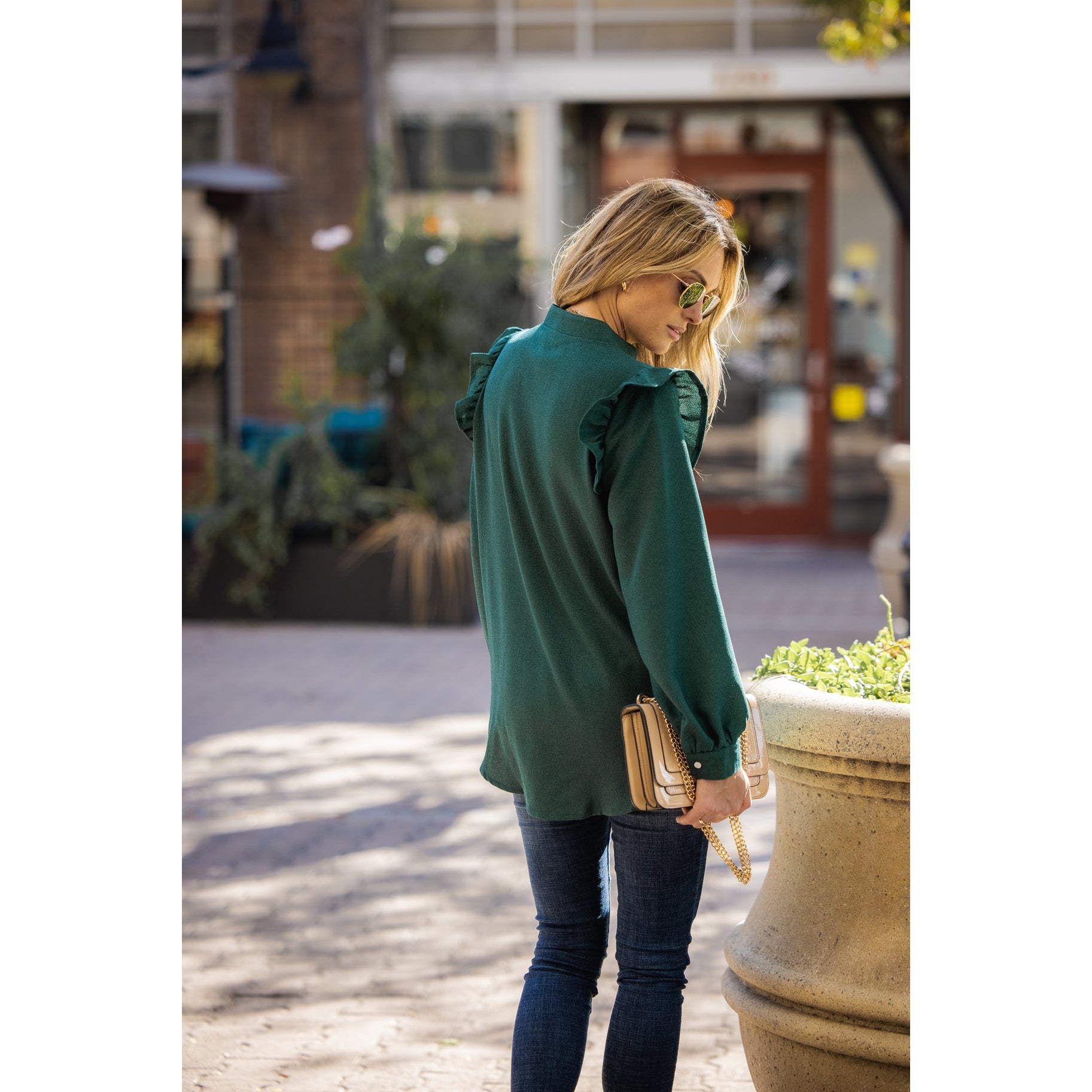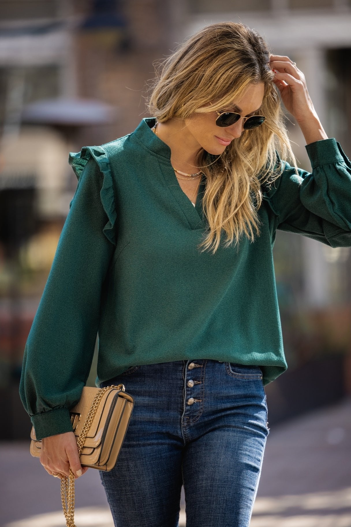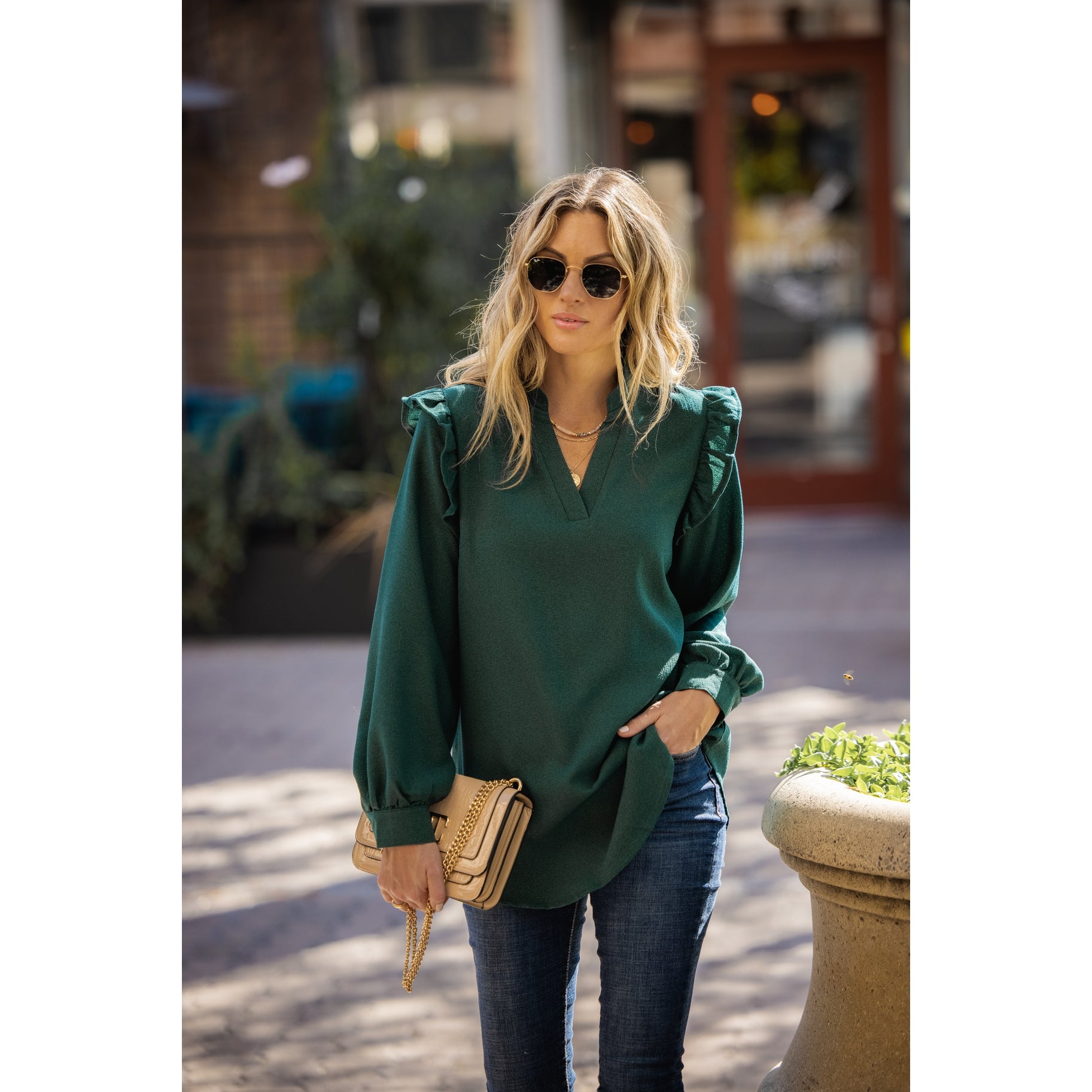 Take your style up a notch with the Woven Ruffle Notch Neck Long Sleeve! Easily adjust your sleeves to fit the occasion and pair them with your favorite denim or jeggings for a fashion-forward look and style!