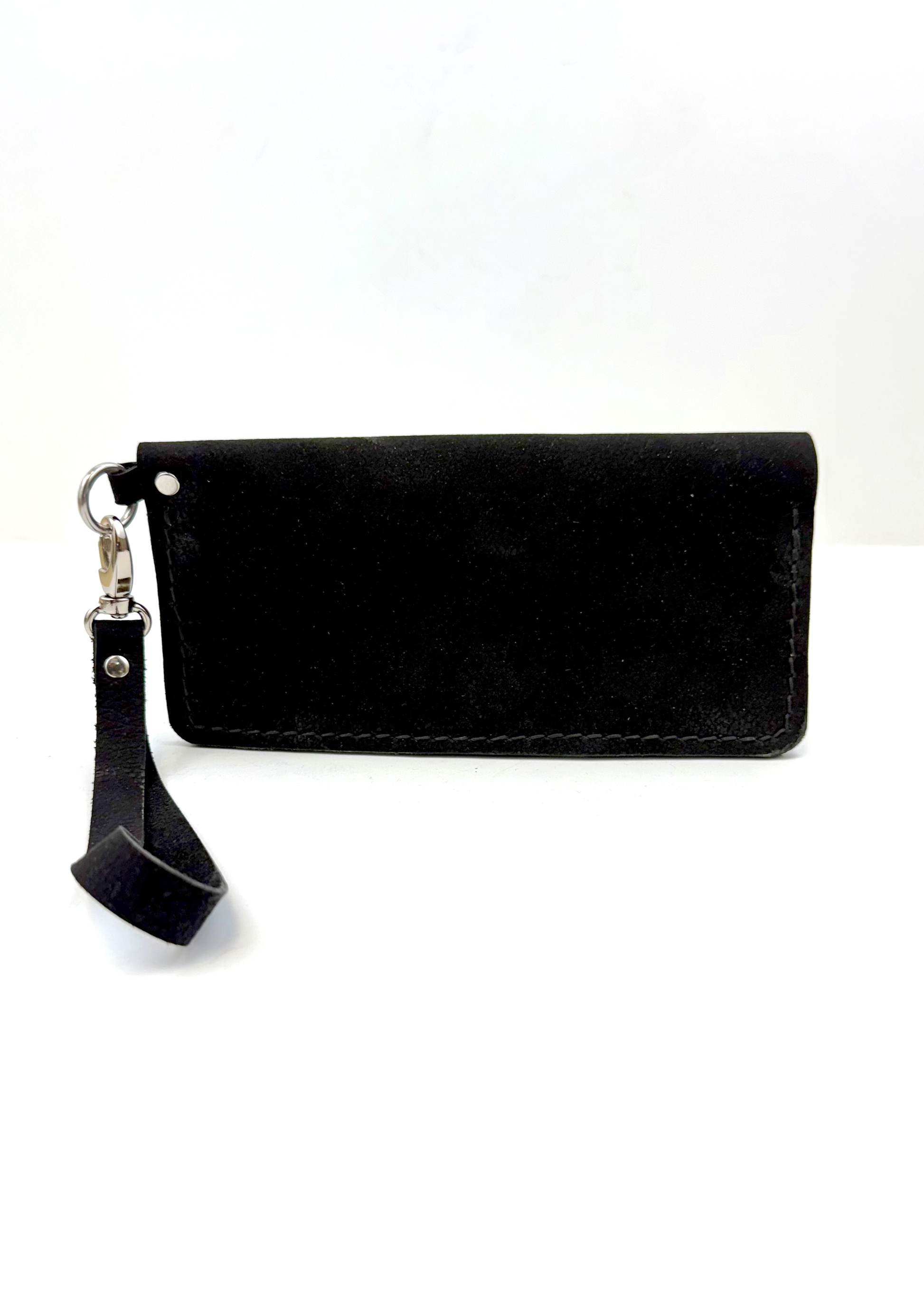 Black Suede Clutch. Item #133. The interior features: 1 large zipper closure, 1 large compartment, wrist strap & 4 card slots. 8" x 4" $50.00.