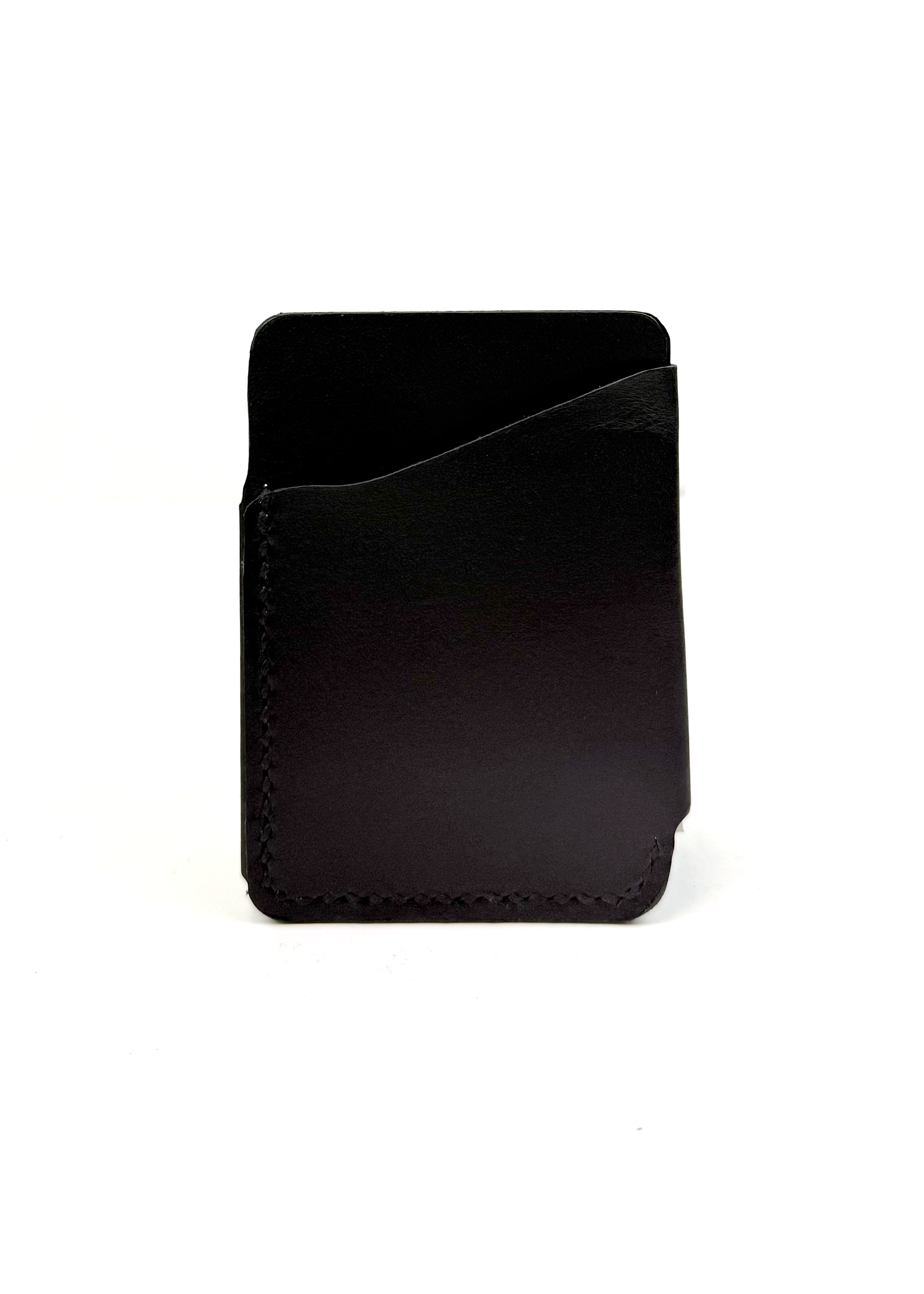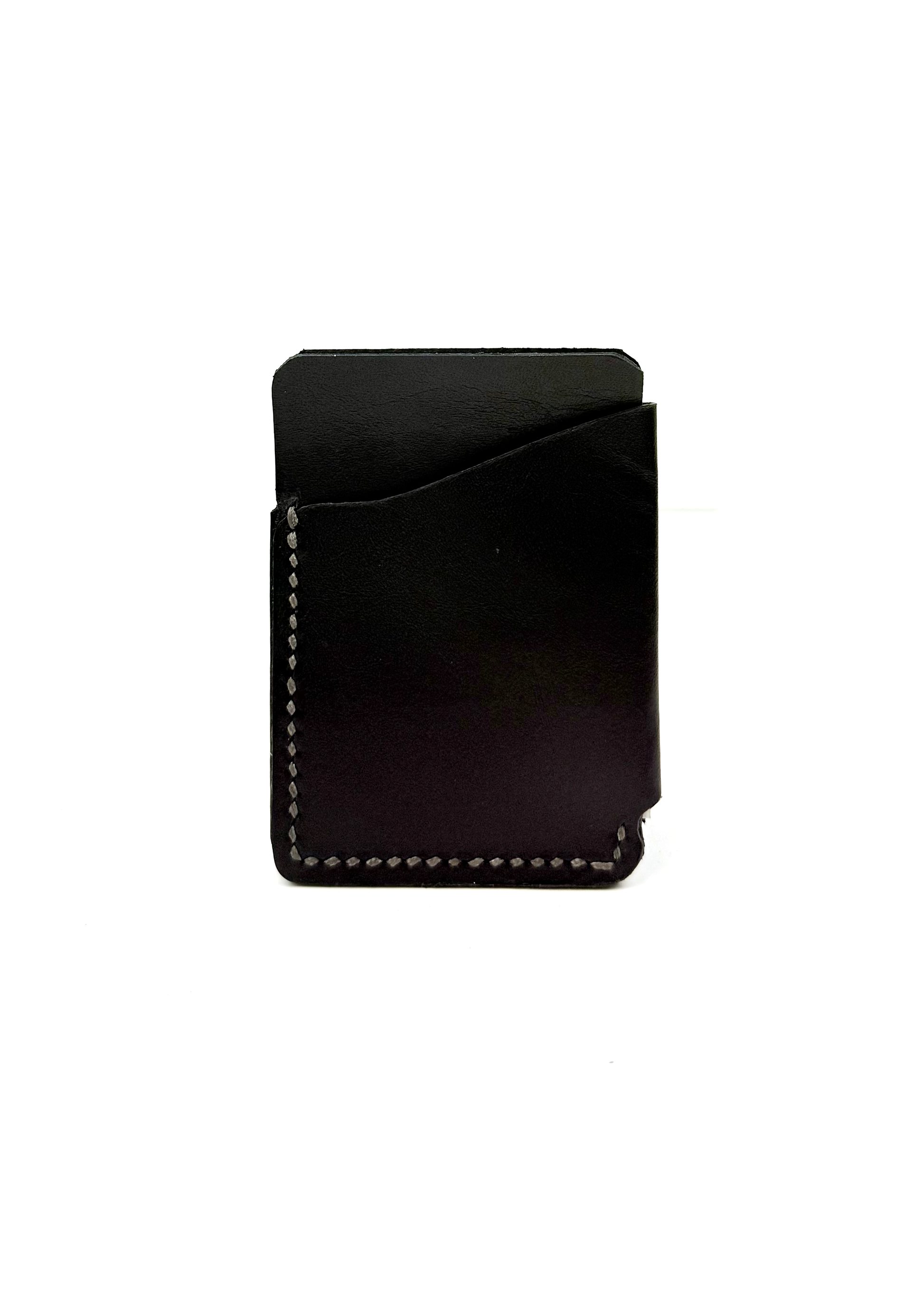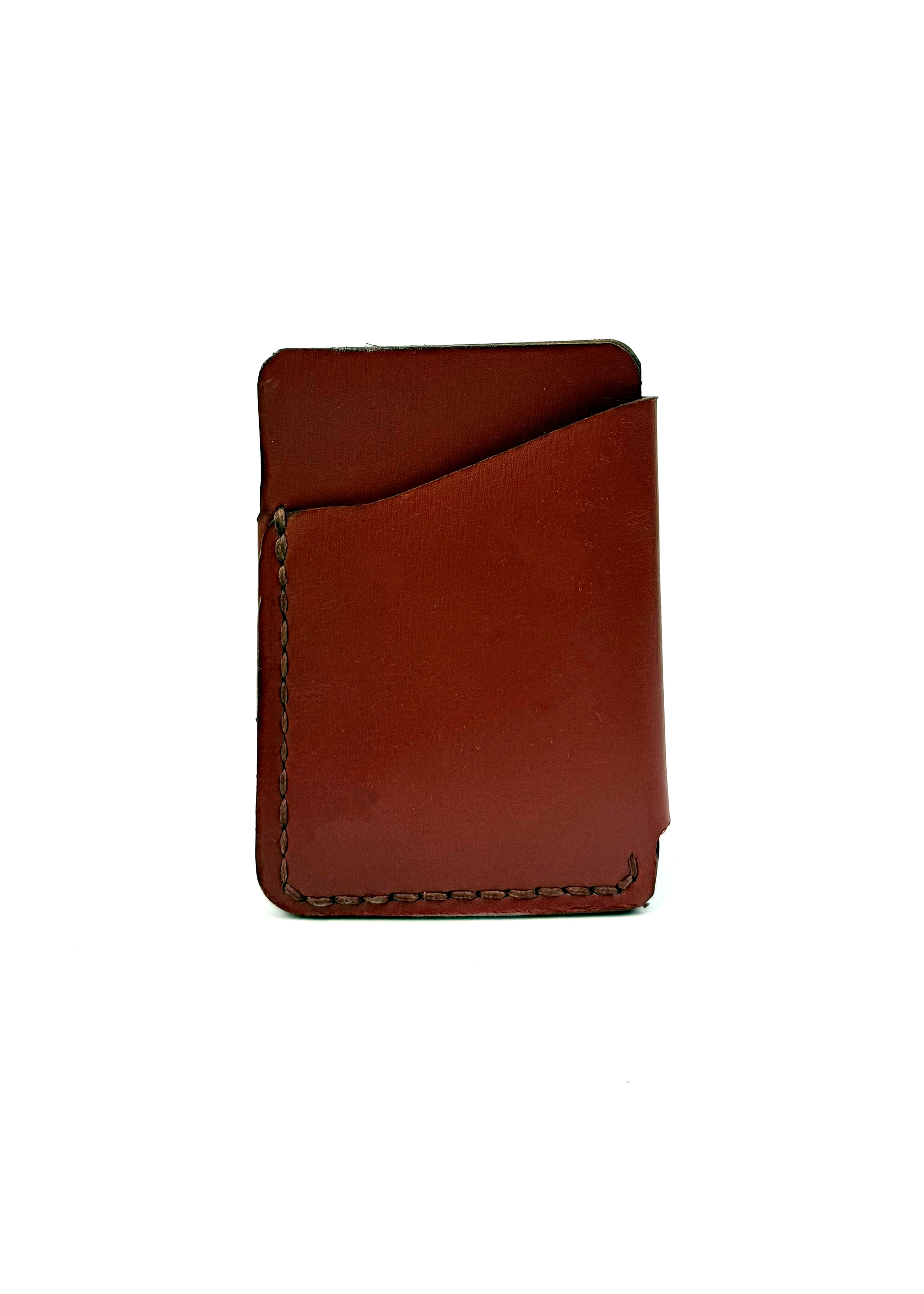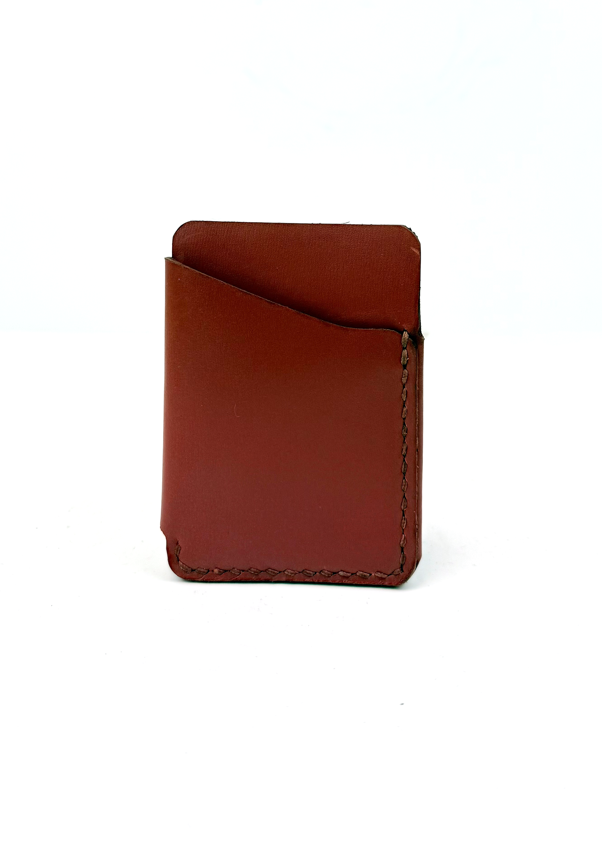 Dark brown slim 2 card wallet. Item # 105. Wallet details: 1 main compartment for cash or coins & 2 small compartments for cards. 4.8" x 3.25". $15.00.