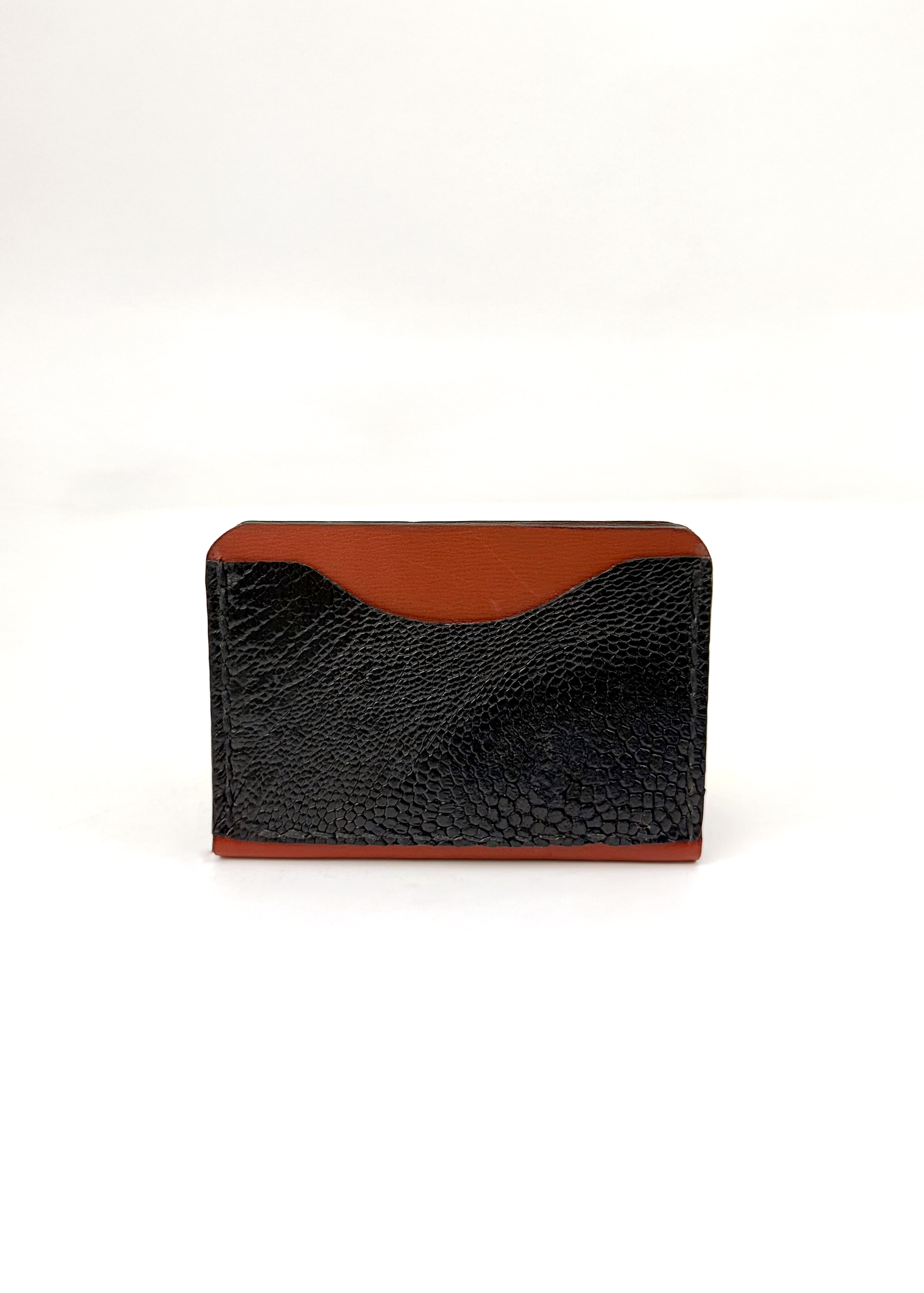 Textured leather bi-fold wallet 2. Wallet interior details: 2 large compartments & 4 card slots. 4.5" x 4 ": $40.00.