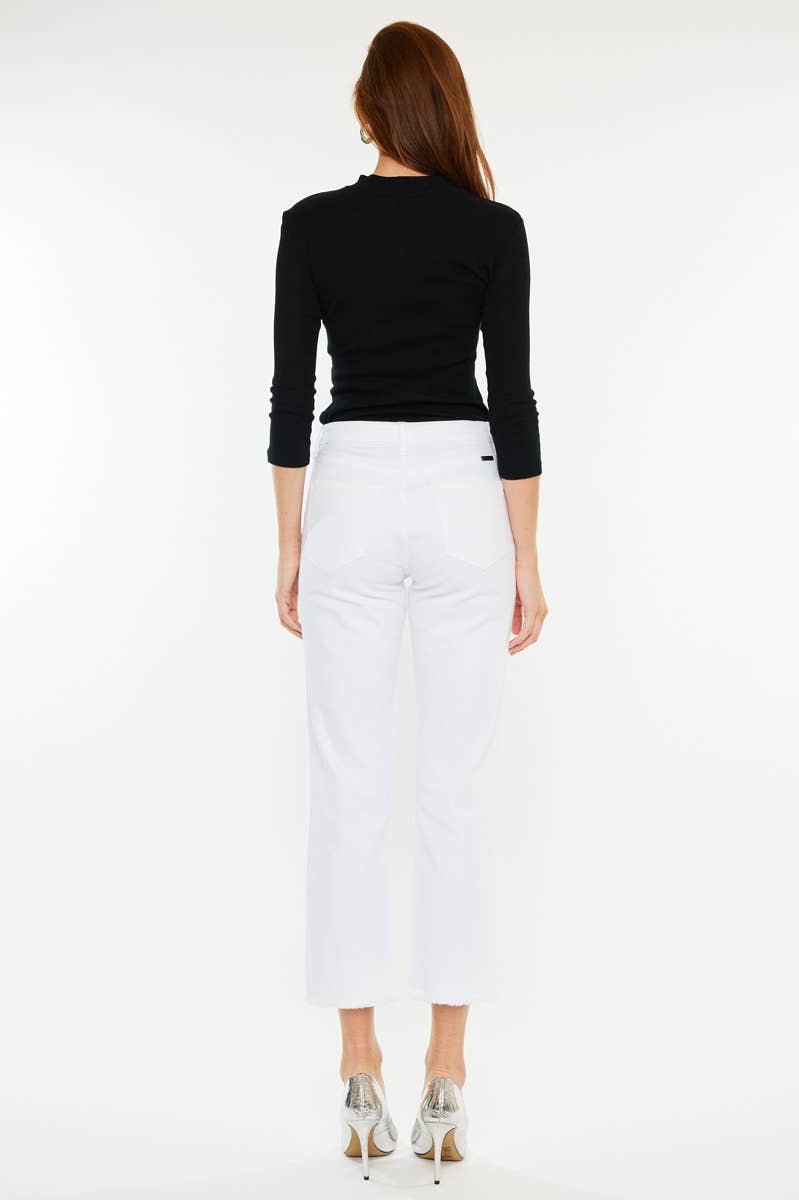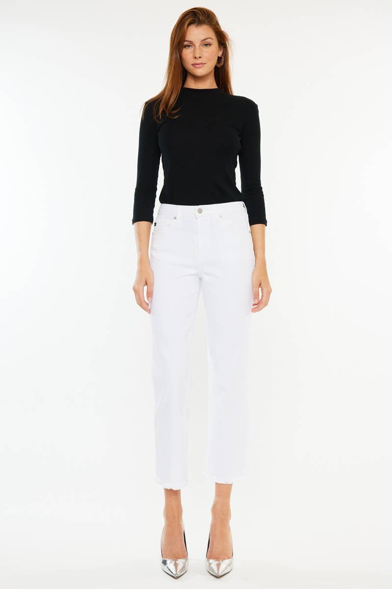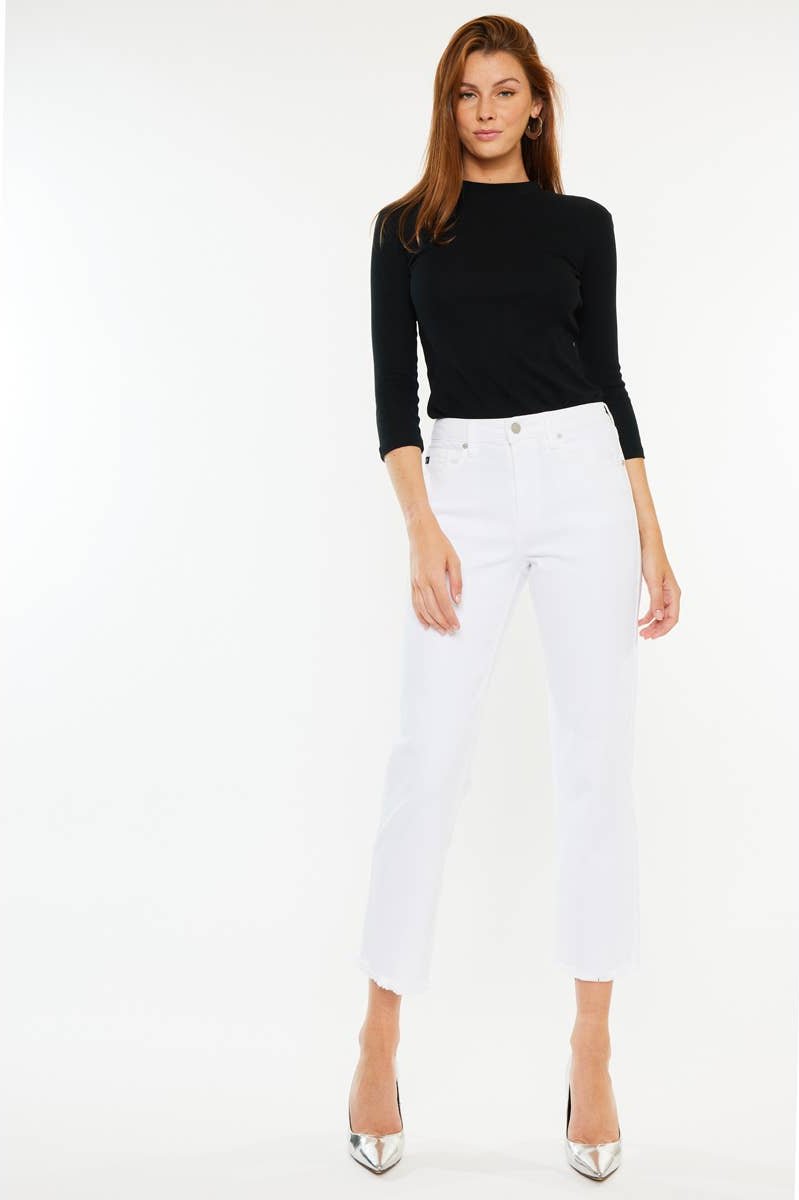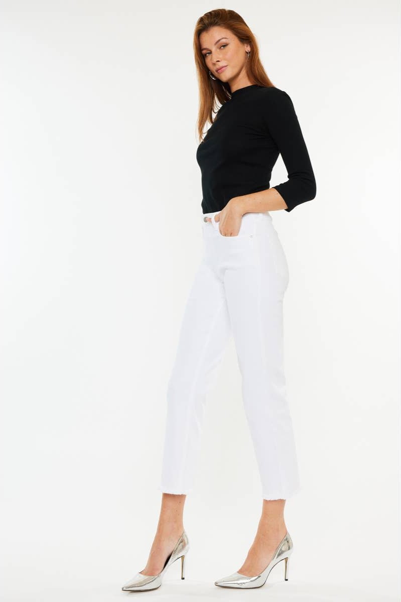 Elevate your style with these KanCan High Rise Cropped Straight Leg jeans. The white color wash, nature-inspired fray hem, and 5 pocket design make for a unique, fashion-forward look. The stretch material and zipper fly ensure a comfortable, easy fit. Upgrade your wardrobe today!