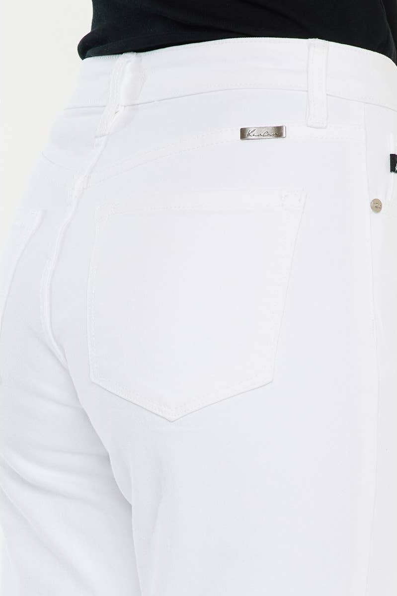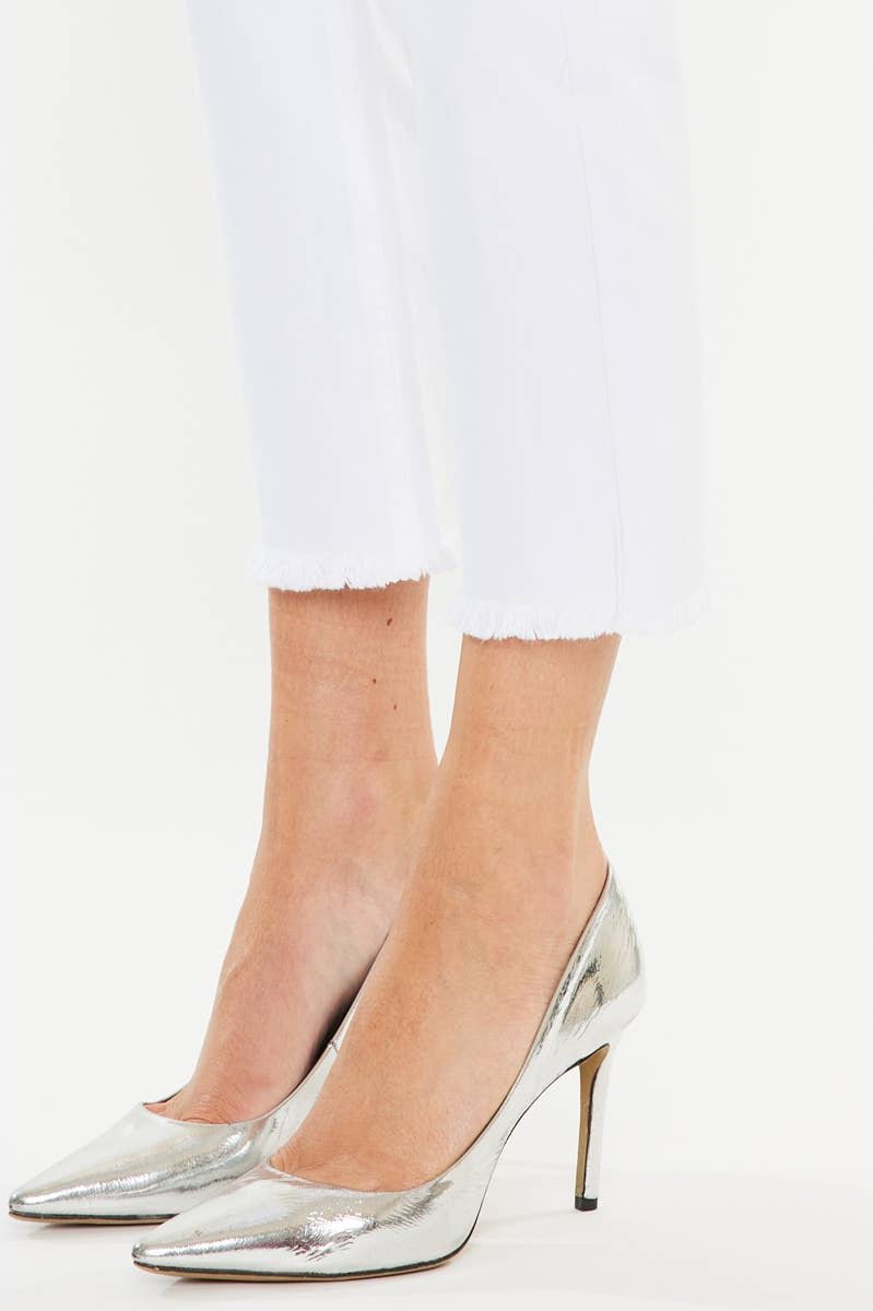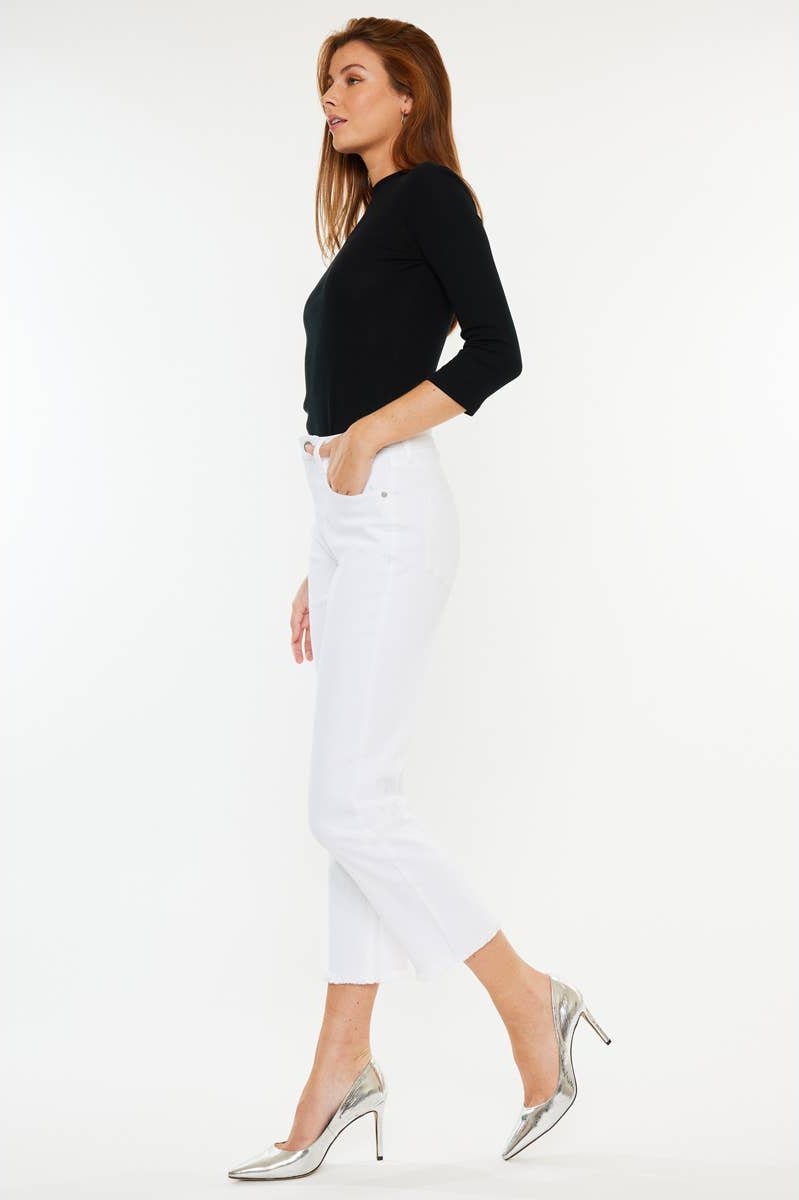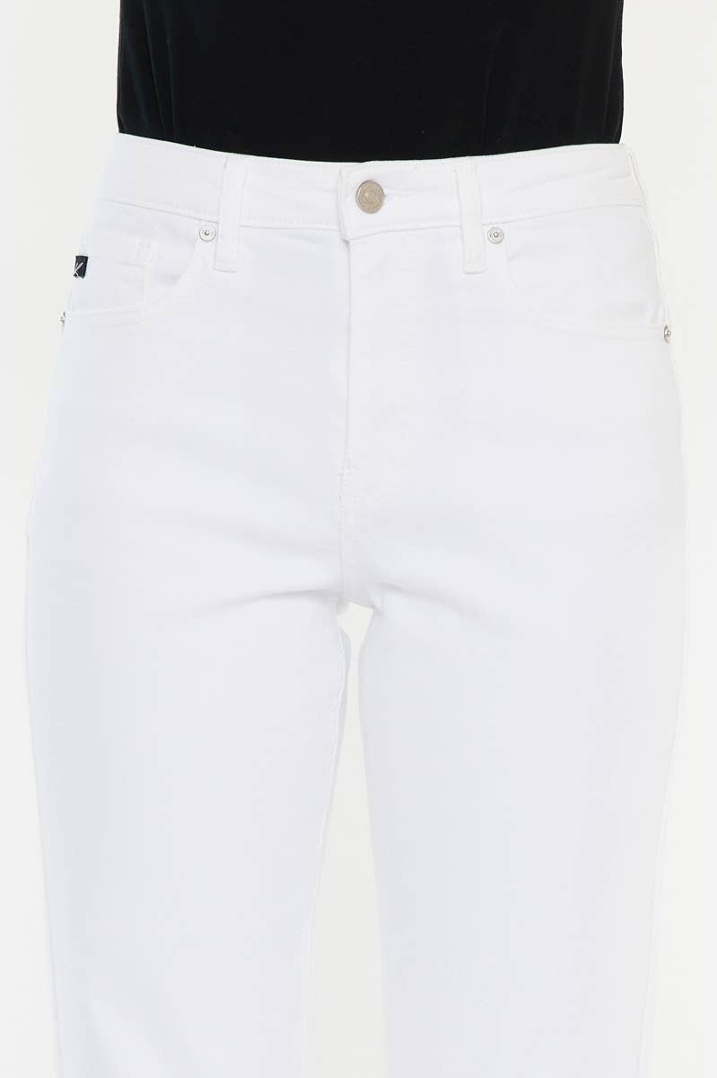 Elevate your style with these KanCan High Rise Cropped Straight Leg jeans. The white color wash, nature-inspired fray hem, and 5 pocket design make for a unique, fashion-forward look. The stretch material and zipper fly ensure a comfortable, easy fit. Upgrade your wardrobe today!