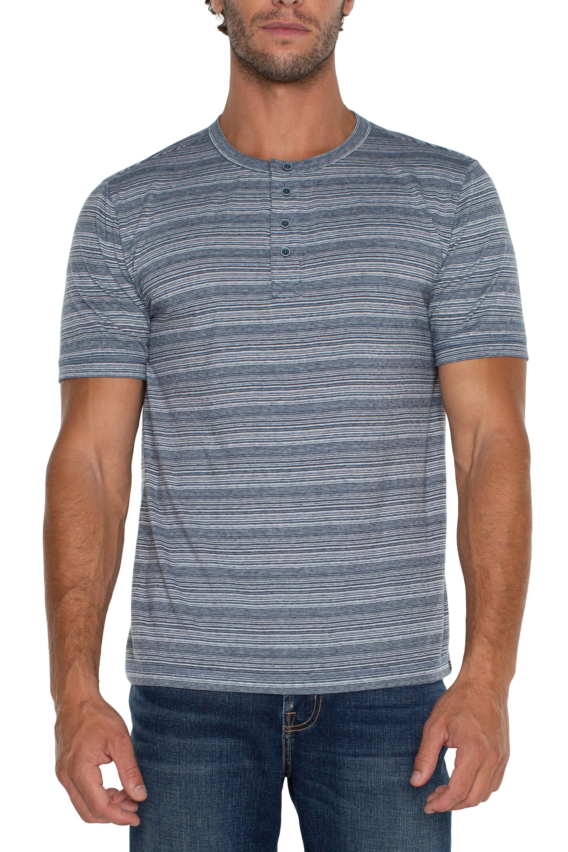 Introducing the Liverpool Blue Striped Short Sleeve Henley - the perfect summer staple for any man. With its classic design and quality construction, you'll stay cool and stylish during the hottest months. Made for men's style, this henley is a must-have for any wardrobe. 50% off Fall clearance sale!