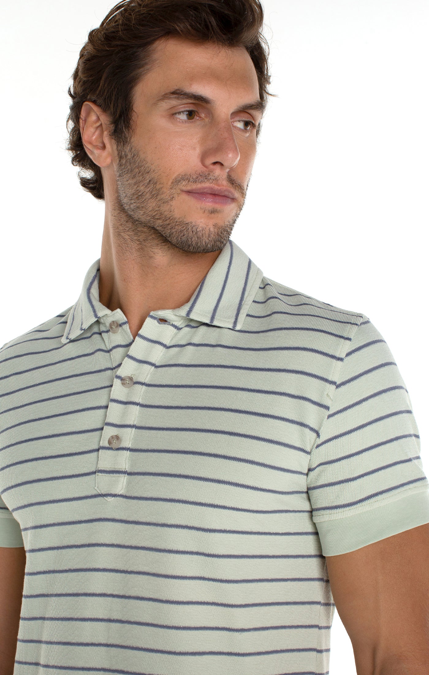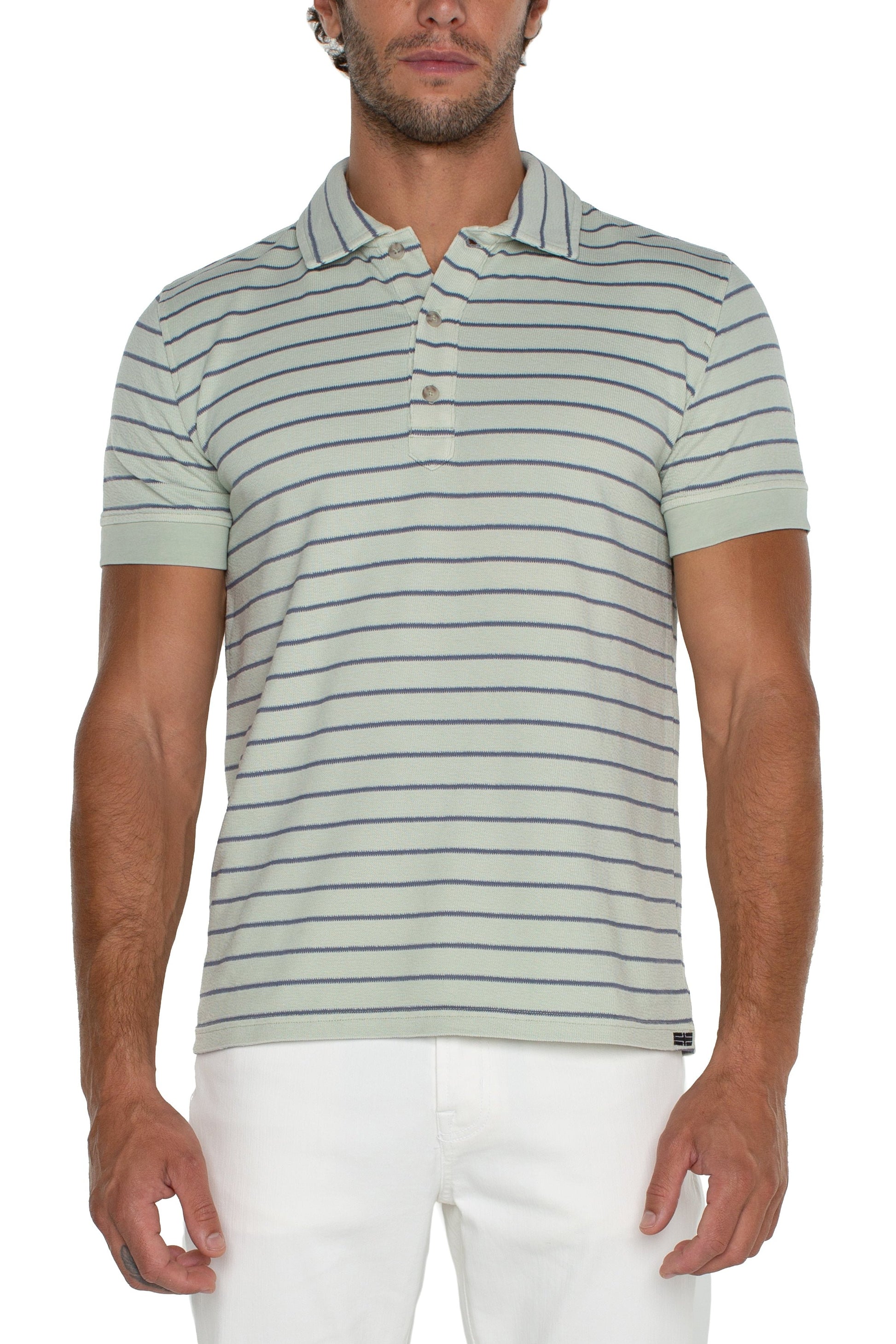 Introducing the Seafoam Polo by Liverpool, perfect for warmer weather. Made from soft, striped fabric, this polo provides both comfort and style. Expertly crafted for a casual yet sophisticated look.