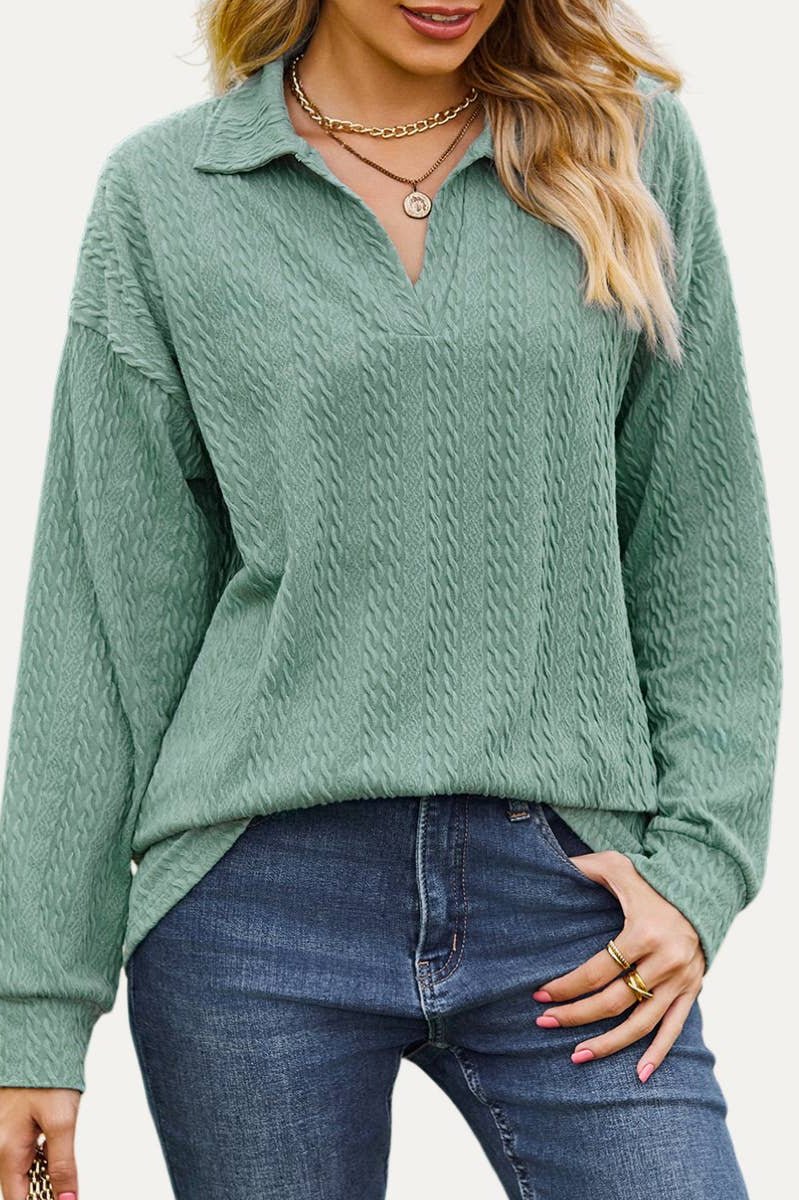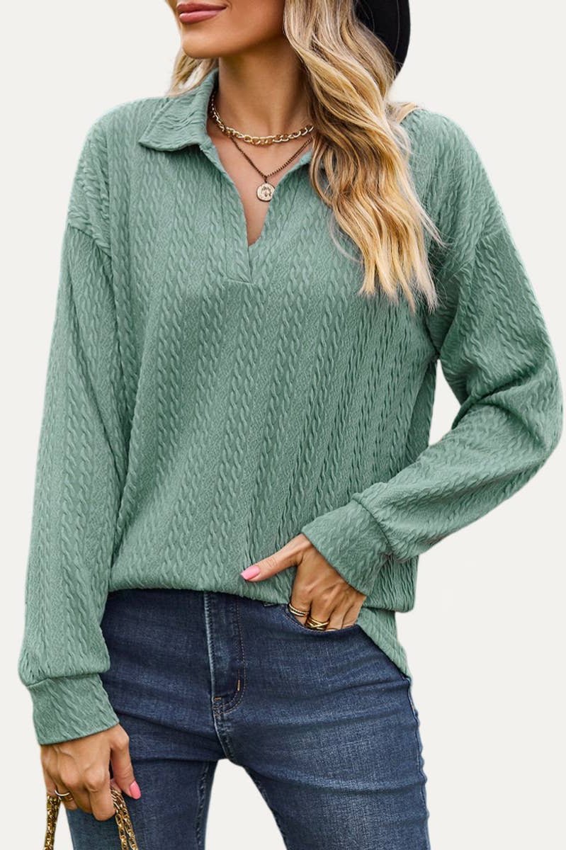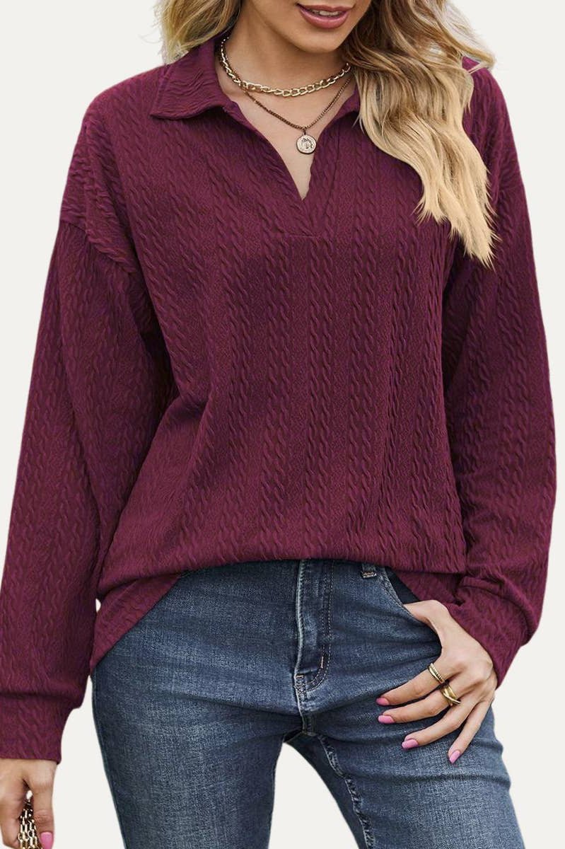 Elevate your everyday style with our Cable Knit Collared Long Sleeve Top. Crafted from a lightweight and textured knit, this top features a classic collared neckline and long sleeves for a polished look. With a relaxed bodice, it's perfect for effortless and comfortable wear. Upgrade your wardrobe with this must-have essential!