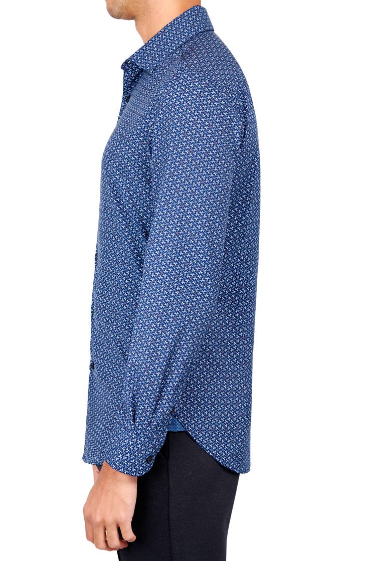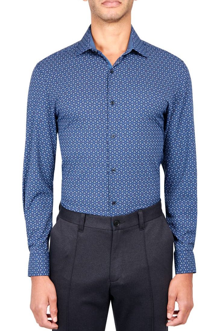 Introducing the Electric in Navy Geo by W.R.K.: a sleek and stylish 4-way stretch slim fit dress shirt. Designed with back darts for a moderately slim fit that accentuates your chest, arms, and waist.